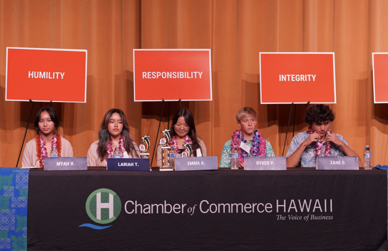 “What makes the Bee especially impactful is that students must ground their ideas in civic virtues — humility, integrity, moderation, respect and responsibility — as well as founding principles such as natural and inalienable rights, equality, consent of the governed, rule of law, separation of powers, and private property,” said the chamber’s Associate Director of Education Sophia Wibholm in response to emailed questions from Aloha State Daily. “This ensures their solutions are not only innovative but rooted in the core values that guide our system of government.