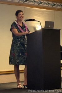 University of Hawaii President Wendy Hensel gives the keynote address at the Chamber of Commerce Hawaii’s Tech Career Pathways Summit.