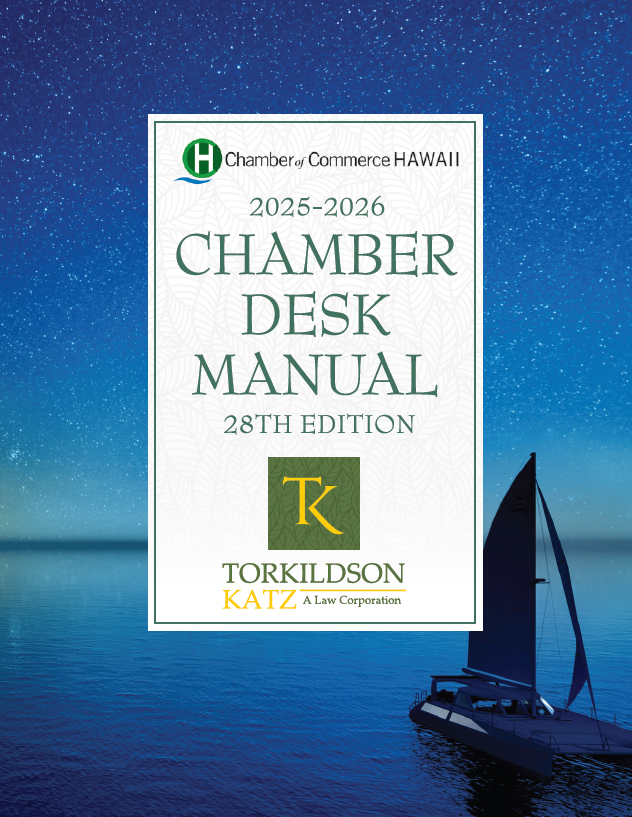 The Chamber Desk Manual contains more than 30 chapters of comprehensive and updated descriptions of federal and Hawaii labor and employment laws and issues. It is authored by the Hawaii law firm of Torkildson Katz, A Law Corporation to provide Hawaii employers with a practical reference manual to use when confronted with the ever-changing nature of employment-related challenges of running a business. Clients may request access by contacting their TK Attorney.
