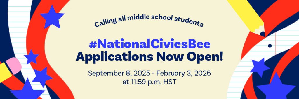 The National Civics Bee® encourages young 6th, 7th, and 8th grade Americans to engage in civics and contribute to their communities. Modeled after traditional spelling and geography bees, the competition gives students the chance to share ideas for improving their communities and show their enthusiasm for civics. The winner of the National Civics Bee® Hawaii State Finals will receive a trip to Washington, DC to compete in the National Civics Bee® national championship in Fall 2026.
