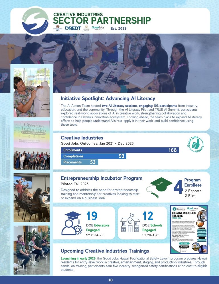 Creative Industries Sector Partnership is an industry-led, community-supported workforce development collaborative. It builds a local, skilled talent pipeline for Hawaii’s high-growth creative industries sector and strengthens the local economy.